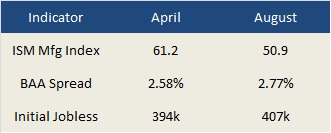 And third is Initial Jobless Claims, reported weekly by the US Bureau of Labor Statistics. This figure shows the number of people who are applying for state jobless benefits each week. This leads unemployment and ultimately impacts consumer spending and economic growth. Since the figure can be volatile, most people pay attention to the average level during the prior four weeks. Historically, an average above 400k has been consistent with a weak job market. Figure 1 shows the changes in these leading indicators since the beginning of last quarter.
