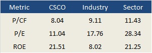 Despite its healthy financial condition and a positive industry outlook, CSCO is trading at a discount relative to its peers. Figure 3 shows CSCO’s current price ratios based on trailing 12-month cash flow and net earnings. In addition, it’s worth noting that despite generally negative analyst sentiment about performance, CSCO has actually delivered a strong return on equity over the past 5 years (shown in Figure 3 as a 5-year average). At the end of the day, isn’t ROE exactly what equity investors are looking for?