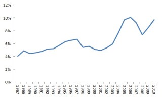 There are basically two ways to increase earnings (aka the bottom line), through revenue (aka the top line) or margins (the in between). Since GDP growth (and thus revenue) has been lackluster since 2008, earnings growth has been dominated by margin expansion. In other words, companies have been squeezing earnings out of revenues by cutting expenses (notice unemployment is still above 9%). The result has been some of the highest corporate profit margins we’ve ever seen in the US, shown in Figure 1 below.
