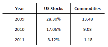 In addition, a simple look at financial market performance could warrant some caution. The returns on typical risky and early cycle asset classes like stocks and commodities have steadily moderated since 2009, shown in Figure 1 below.