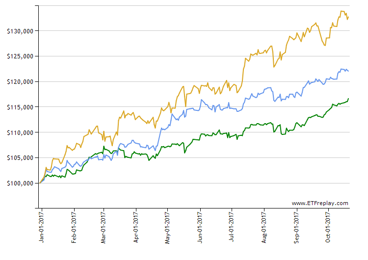 Investors faced a litany of doubts this year. Raging dysfunction in DC, a string of natural disasters, and even threat of nuclear war. But investors aren’t shaken. Year to date the S&P 500 is up 16%+, the EAFE 22%, and EM 32% (represented below by returns for SPY, EFA, and EEM respectively).