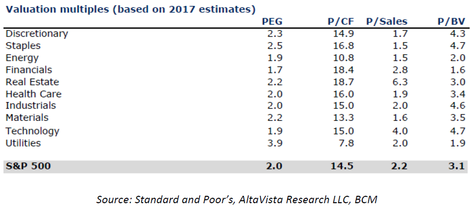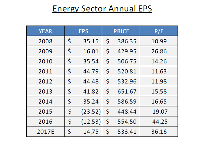 The 36x multiple assumes eps of $14.75 for 2017. Relative to history, that’s low, but makes sense since we know earnings are bouncing off a negative level. If we exclude the abnormal reads, normalized eps for the sector are about $36 (by coincidence).