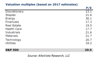 Valuations look high across the board. And at the surface, energy looks most expensive at 36x earnings. But digging deeper yields some unexpected results. Energy took large write-downs in 2015 and 2016 when oil prices collapsed into the $20’s. Reported earnings were negative for both years. Not only was that abnormal, but it also makes valuing on earnings difficult.