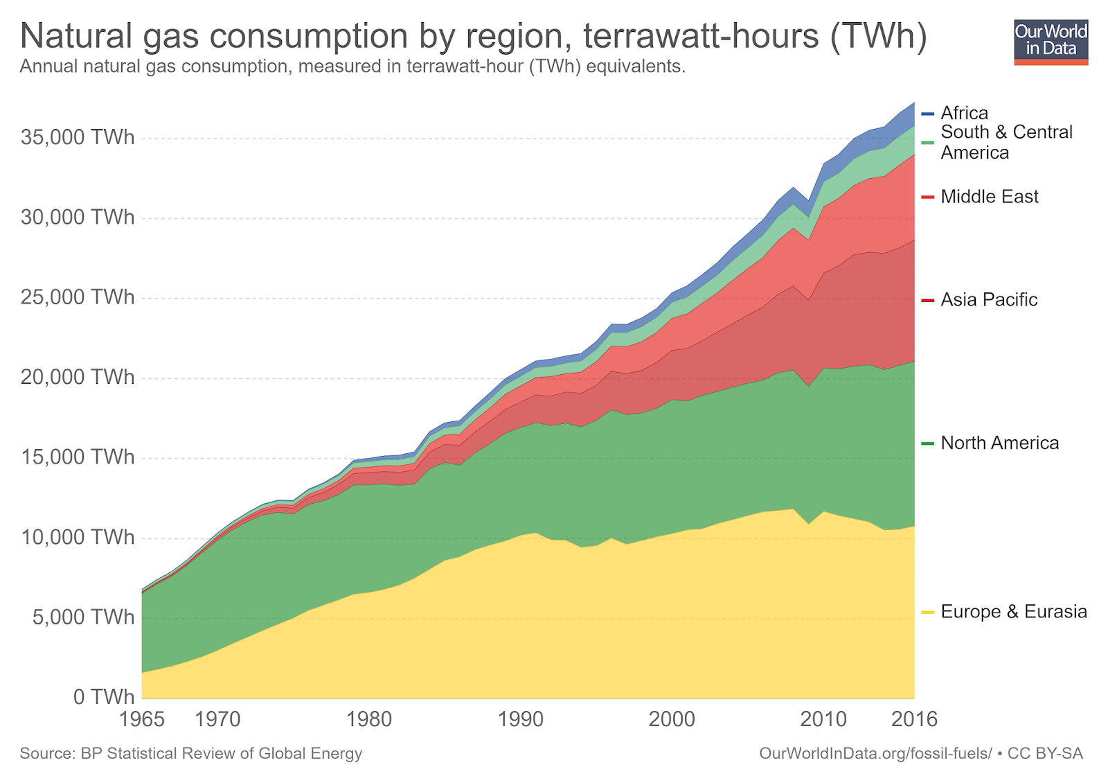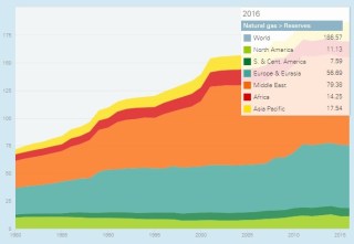 Topping it off, the world possesses healthy natural gas reserves, estimated at roughly 1.2 trillion cubic meters (tcm) as of 2016. The Middle East holds the largest reserves at close to 79.38 tcm. In comparison, US reserves are estimated at only 8.71 tcm. According to the US Energy Information Agency, even that could support domestic demand for an estimated 85 years.
