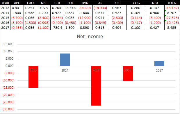 Some stock price weakness was justified since weak natural gas prices did translate into weaker earnings. That being said, with natural gas prices bouncing on what looks like a bottom, the worst may be behind us. In fact, earnings for natural gas stocks have been improving over the past five years, shown below for the ten largest natural gas names.
