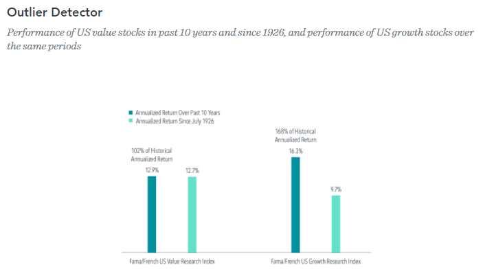 In reality, what has not behaved as expected is the performance of growth stocks. Growth stocks have delivered an annualized return of ~16% over the past decade, well above it’s long-term historical return of ~10%. In other words, the outperformance of growth stocks has been the real outlier, not the underperformance of value.