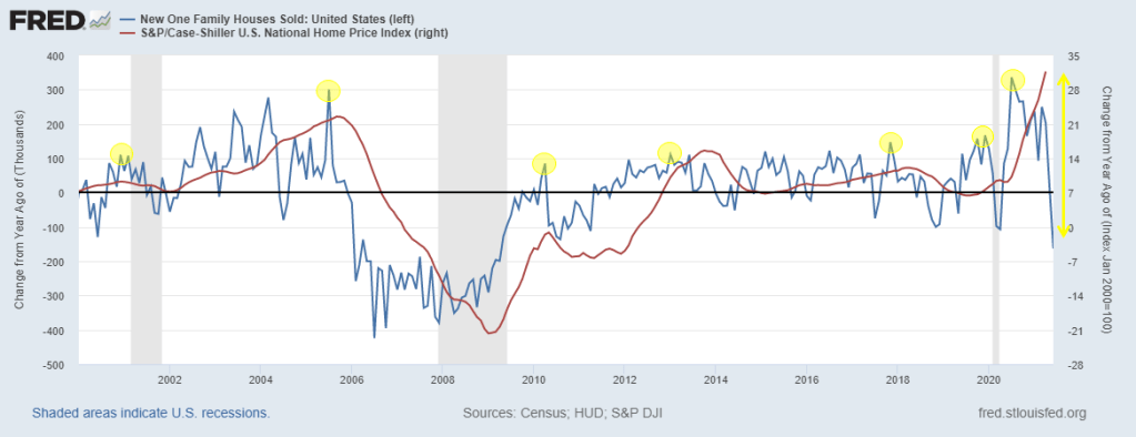 The silver lining to a downturn in new home sales is a long lead time with respect to the business cycle. It can take many months, even years, for a recession to show up, and sometimes it doesn’t at all. I don’t think the current move in new home sales by itself is a harbinger for a near-term recession. As I’ve been writing all year it will take a huge shock (more than just weakening home sales) to stop the momentum of this runaway economic train.