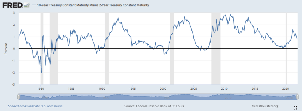 To be clear, fair, and not alarmist, I’m not predicting we’re heading into a recession (I don’t know when that happens). Realistically, I’m talking about a potential bear-flattening, that could potentially lead to an inversion of the yield curve. That’s hardly a precise prediction. And even if it does happen, there’s a long lead time for both rate hiking and inversions (with respect to contractions).