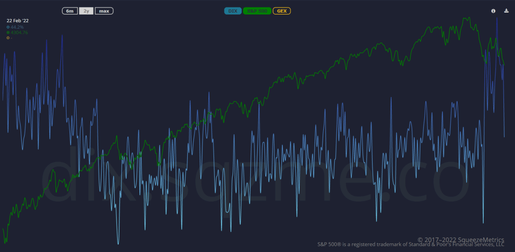 Some would consider this to be a contrarian indicator. Institutional buying activity in dark pools shows the “smart money” was accumulating stock as markets sold off in January and February, shown as DIX below. That could have just been dealers adjusting their hedges. Regardless, today was an exception that saw a sharp reversal into risk-off positioning as Russia moved into Ukraine.