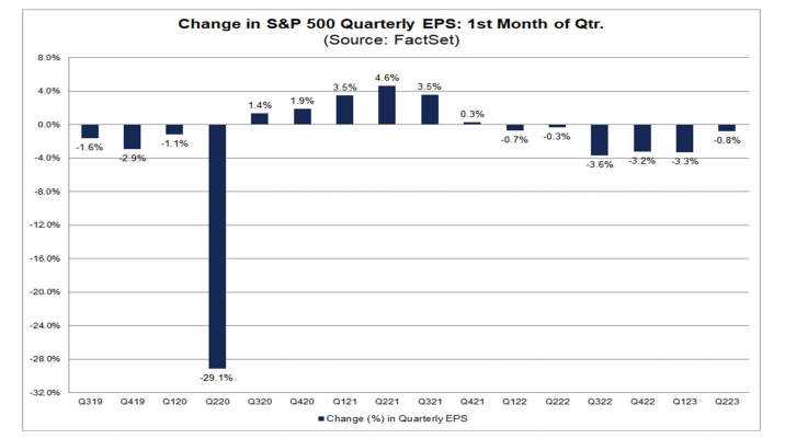 Coming full circle, let’s see how this relates to the U.S. stock market today. Despite breaking headlines about how companies are “beating” earnings estimates, it is worth noting those “beats” were against estimates that were aggressively revised downwards over the past several months. Meanwhile, earnings growth peaked in 2021, declined throughout 2022, and continue to slow in 2023.