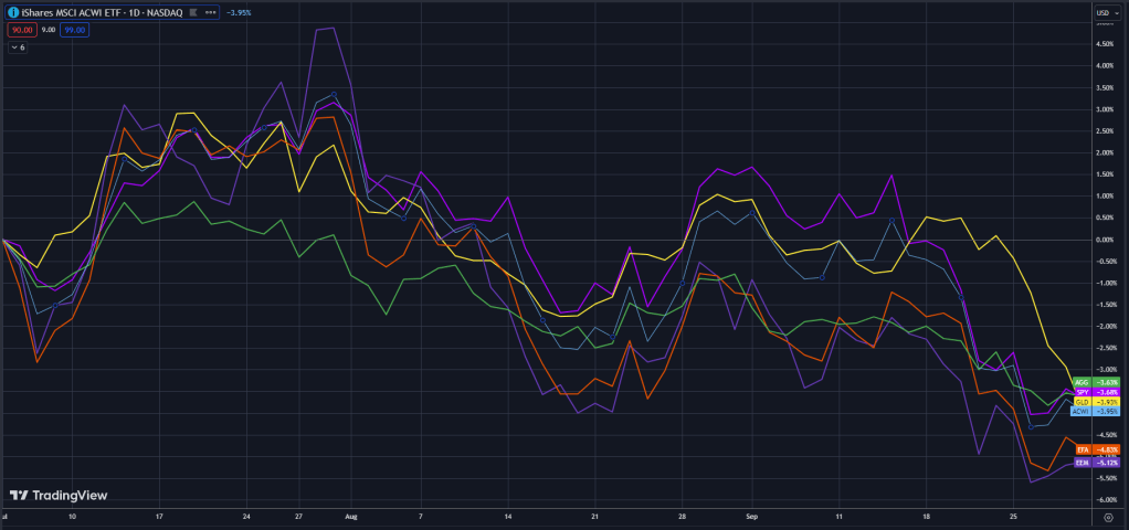Markets moved lower in Q3 and off their highs reached in July. The global stock market was down -3.95% in the quarter (ACWI). Meanwhile, the U.S. bond market was down -3.63% over the same period (AGG). Economic indicators were mixed as the U.S. economy continued to search for a definitive direction.