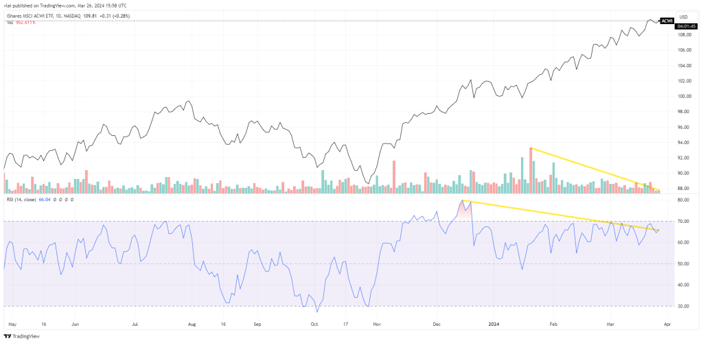 The primary critiques of current market conditions are in volume and momentum. Particularly in the global equity market (ACWI), we’re seeing price advances on both declining volume and momentum (yellow highlights below). This divergence suggests fewer investors are willing to buy stocks as prices move higher.