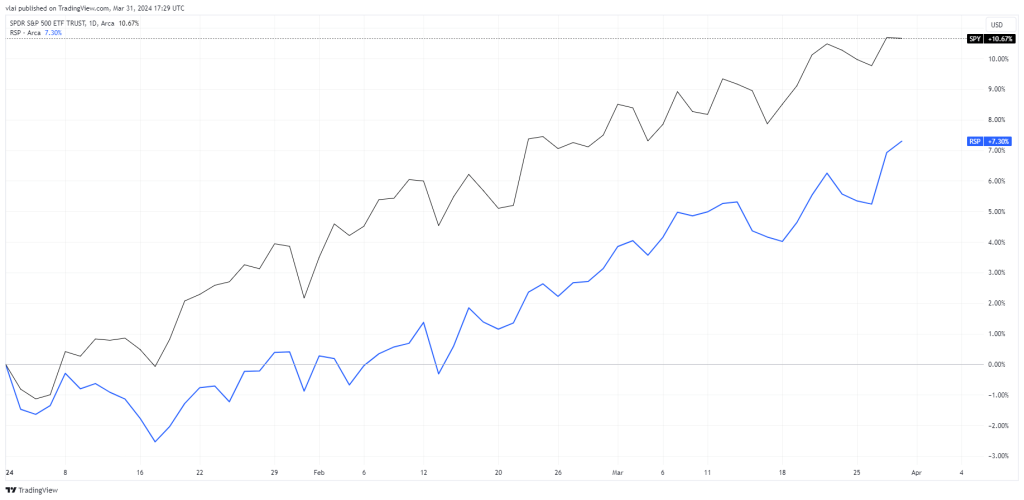 The chart below compares the standard S&P 500 index (SPY in black) to an EW index (RSP in blue). The two indices are currently more in sync and trading closer together compared to 2023. EW is still trailing S&P in 2024, but the spread is narrowing and only about ~3%. In 2023 there were times when the spread widened to double digits, and times when the indices moved in different directions.