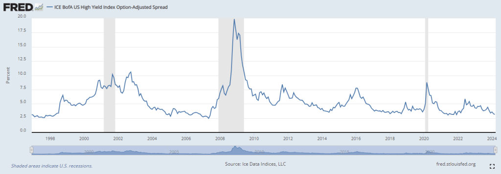 Likewise, credit spreads paint a similar picture. The ICE BoA High Yield Spread Index (which measures junk bond vs U.S. Treasury yields) is on a downtrend and near the lowest levels in decades. The low spread indicates investors are not demanding substantially higher interest rates to accept riskier bonds. In other words, bond market sentiment is good and risk appetite is strong.