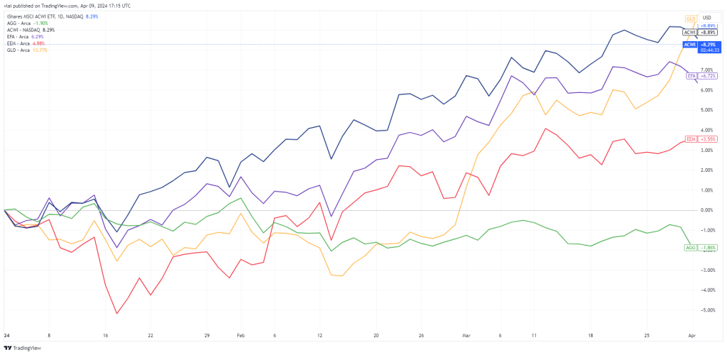 The global equity market advanced another +9% in Q1 2024 (represented by ACWI below). U.S. stocks led the way, again. The U.S. bond market (AGG) prices fell -2% over the same period. Gold prices (GLD) moved sideways for much of the quarter but jumped almost +10% in February. The biggest headline in Q1 was Bitcoin (it’s back) which rallied up +73% from January to early March, reaching a new high of over $73k per token.