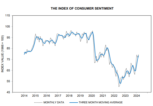 The strong jobs market is contributing to improving consumer sentiment. The University of Michigan’s Consumer Sentiment Index had a revised read of 79.4 in March. This is off of January’s high, but is still a big improvement over the past year, and the 50-levels it saw in 2022.