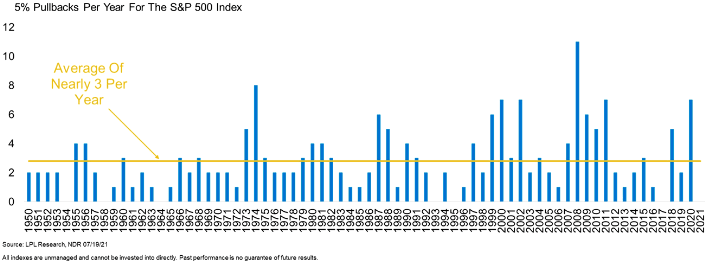 To put things into perspective, the S&P 500 is only down about ~5% from its March high. Yes, that’s more than we’ve seen in a while, but it’s not out of the ordinary. In fact, it happens about three times per year on average historically.