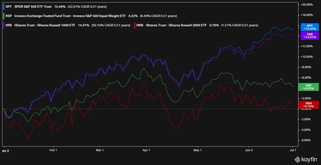 Unfortunately, concentration reemerged during Q2 with big tech again pulling away from the rest of the market. An equal-weighted measure S&P 500 (RSP) was negative in Q2, while the tech sector led a market-weighted S&P 500 (SPY).