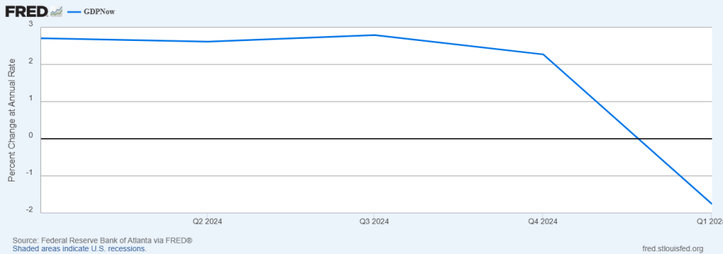 The most alarming data point was the Federal Reserve of Bank Atlanta’s GDPNow indicator. It turned negative in February for Q1, dropping as low as -2.8% (indicating economic contraction).