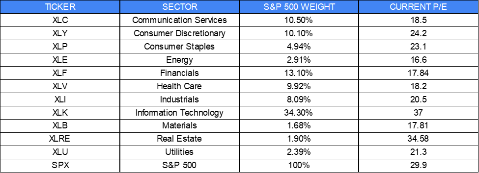 A P/E of 30x is still relatively high, but if we look hard enough, it doesn’t look as bad. It turns out much of the market’s extreme valuation is concentrated in big tech. The table below shows the information technology sector not only has the highest P/E but also the largest weight (influence) in the S&P 500 Index.