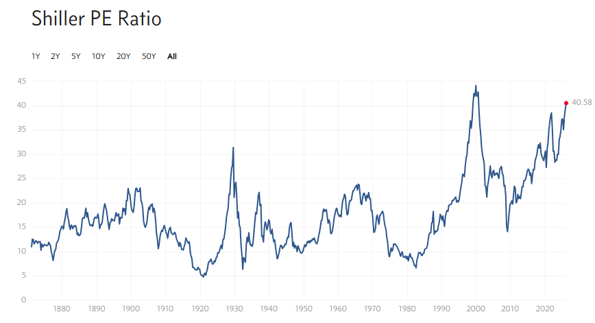 Yet, other measures look different. For example, the venerable Shiller P/E Ratio shows the S&P 500 hasn’t surpassed the high reached during the Dot Com Bubble. Sure, the Shiller P/E is high, but 2000 showed it can go even higher. Judging by MC/GDP, maybe much higher.